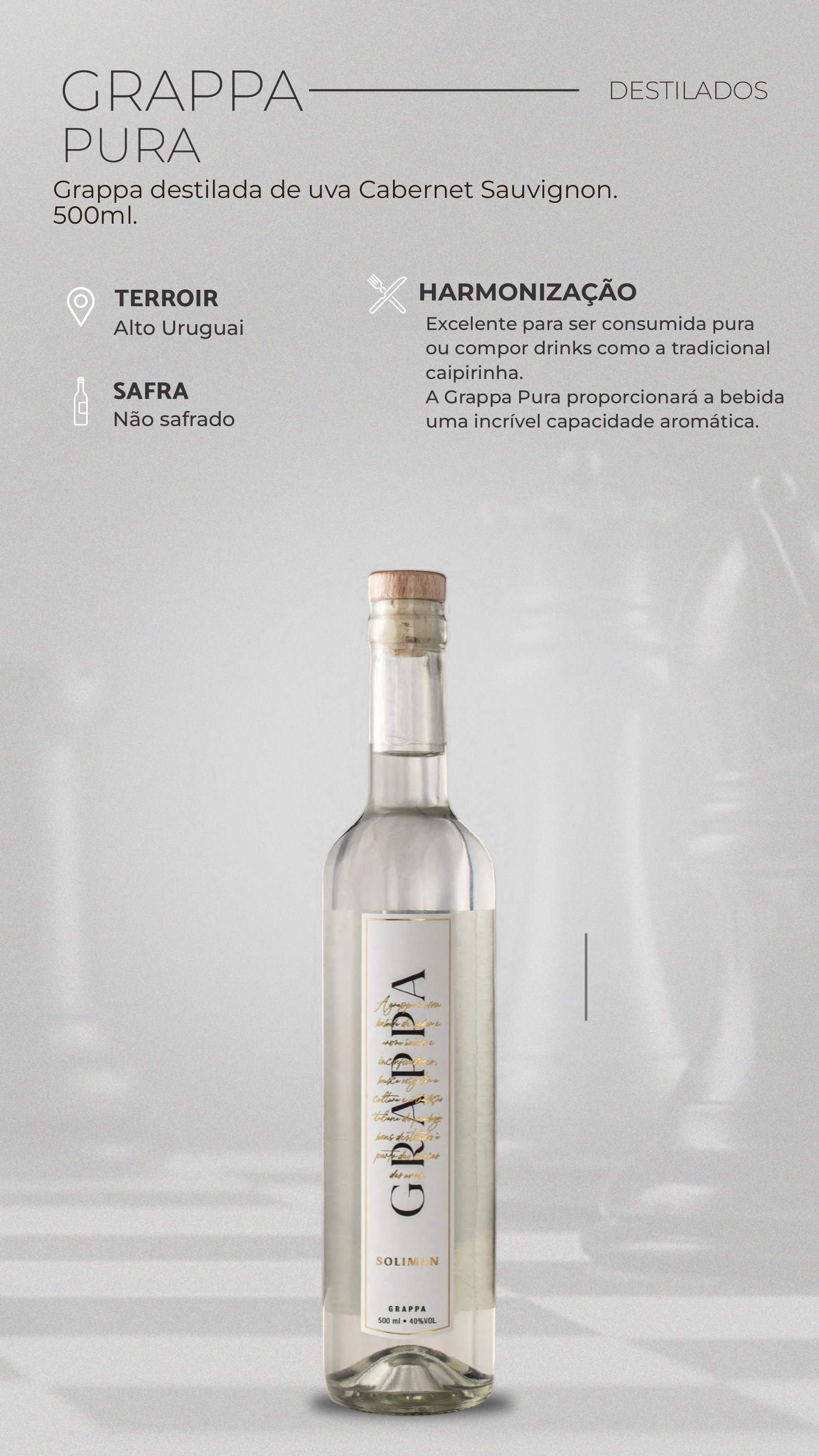 A Grappa Pura é um produto que busca resgatar a tradição italiana de produzir bons destilados a partir do bagaço/cascas das uvas fermentadas. Na sua elaboração se aliam, conhecimento, tecnologia, cuidados com a matéria prima, rigor técnico e um pouco de amor pela história desta bebida.