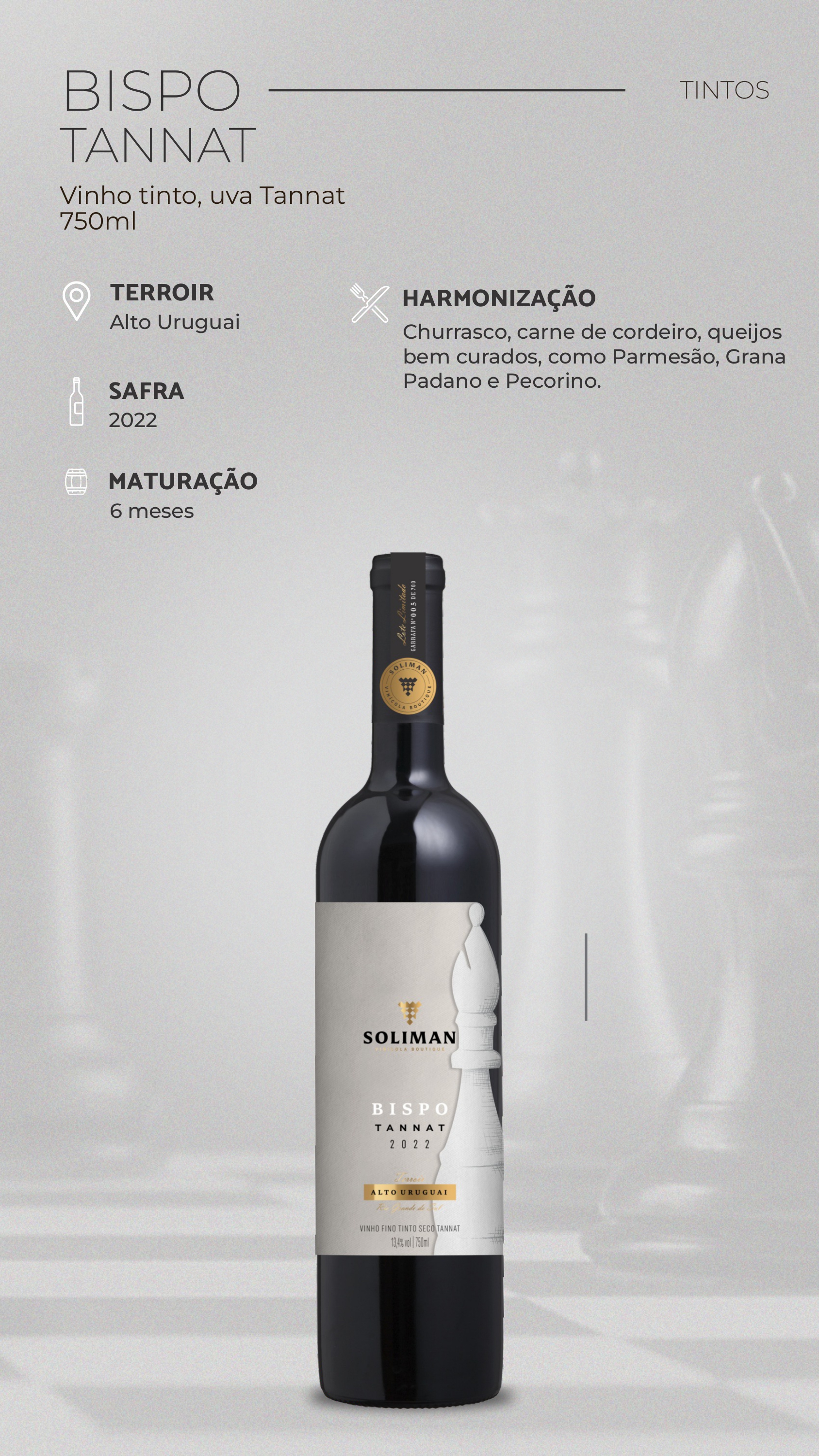 Nosso Soliman Bispo Tannat, nascido nos terroirs singulares do Alto Uruguai RS, é a expressão máxima da força e da elegância desta uva emblemática.