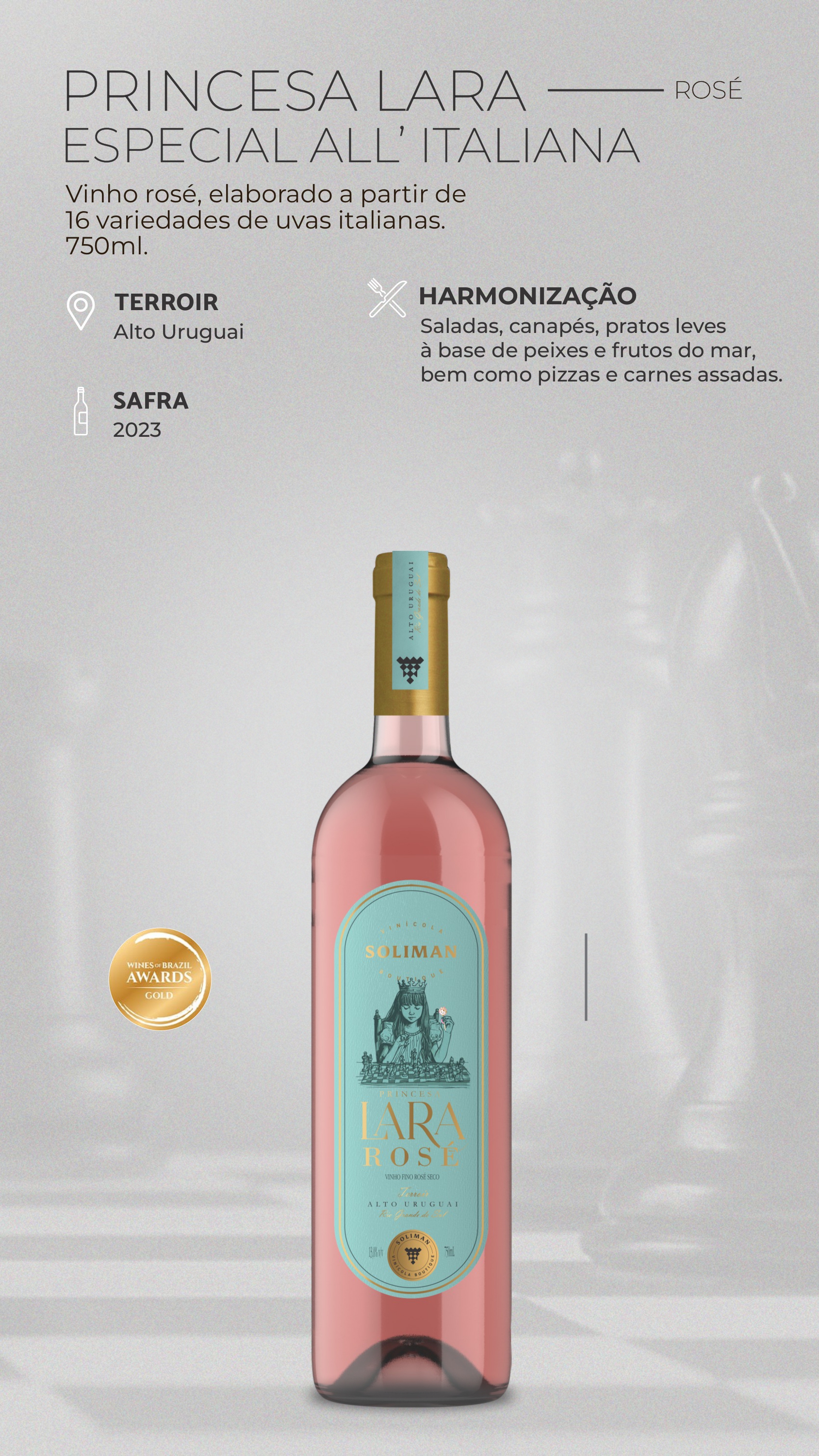 O Soliman Princesa Lara Rosé é uma homenagem terna e encantadora à pequena Lara, filha de Rogério e Vanessa Soliman, e um tributo à tradição vinícola do Alto Uruguai, RS.