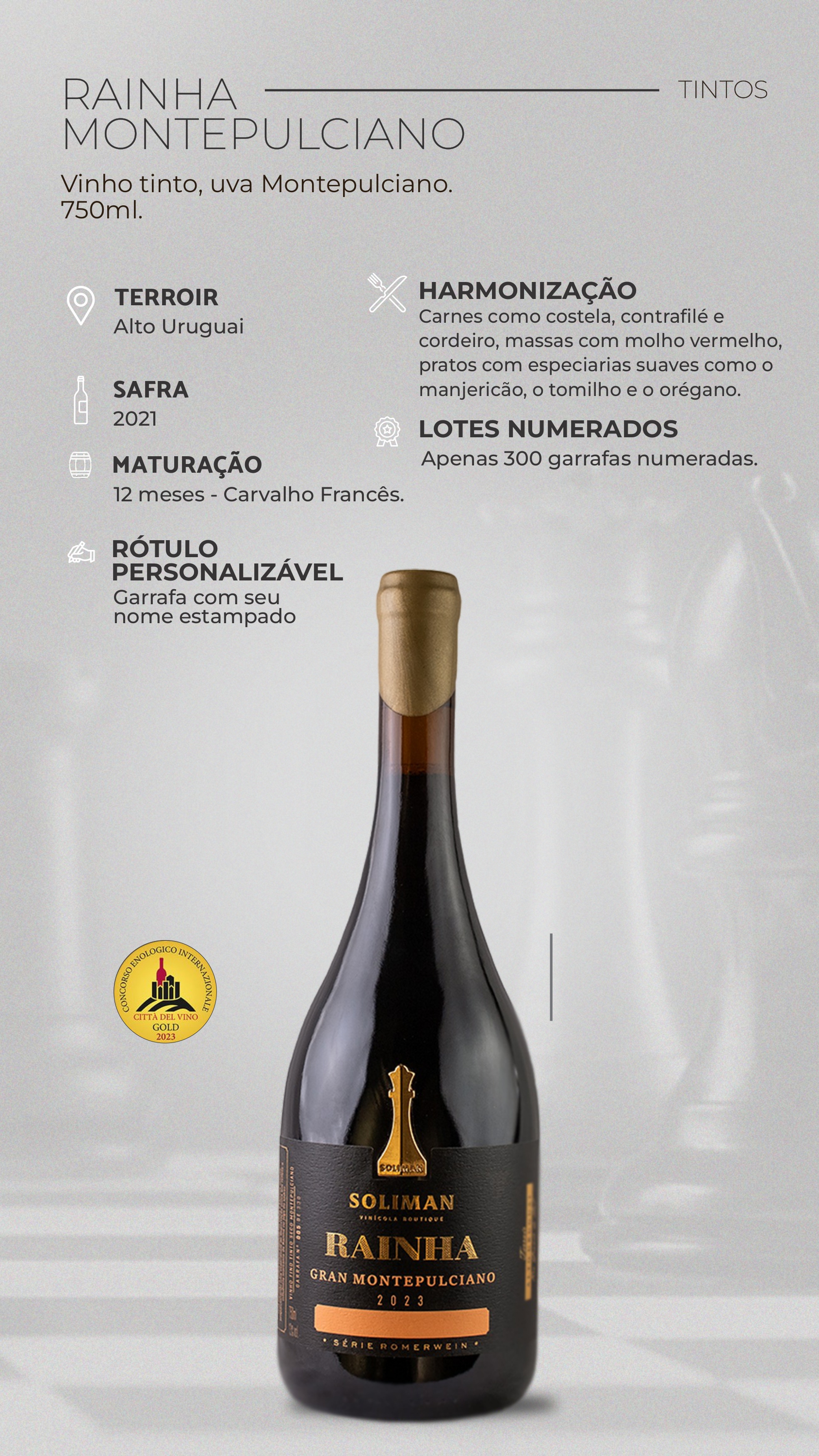 Premiado com Medalha de Ouro na Itália, este vinho é a prova do compromisso da Soliman Vinícola Boutique com a excelência e a qualidade. Sua elegância e complexidade o tornam um vinho requintado, reservado aos paladares capazes de reconhecer e valorizar os pequenos detalhes que fazem um grande vinho.
